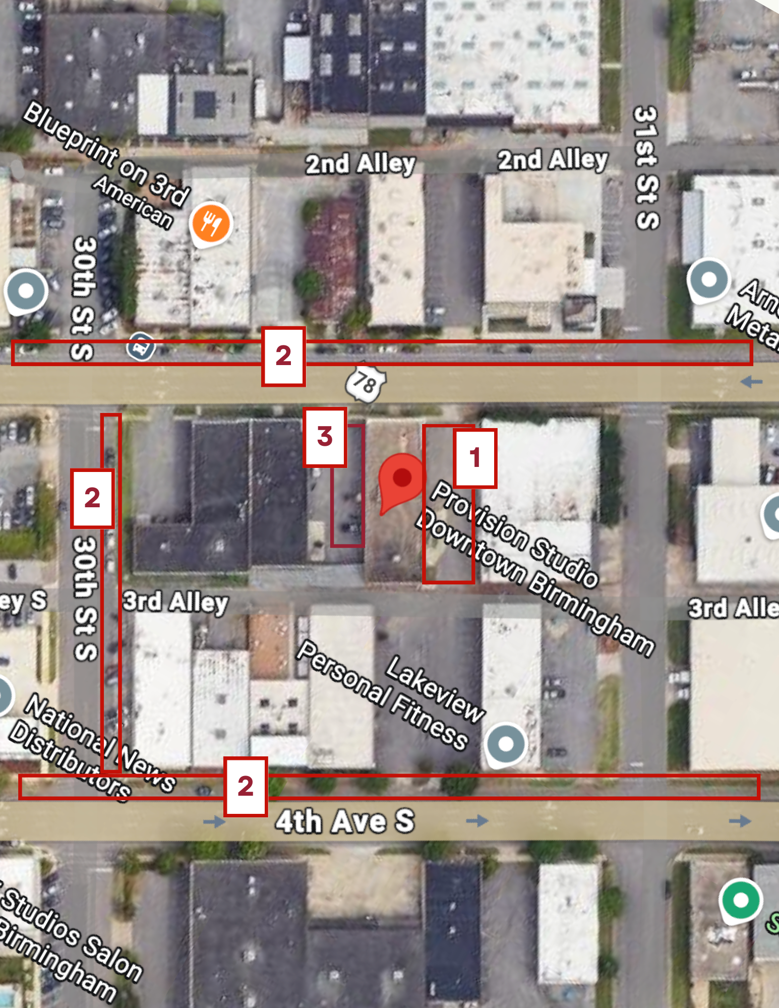 Magic City Stitches has also given us permission to park by their store — it is to the right of the studio (the other side of the building)